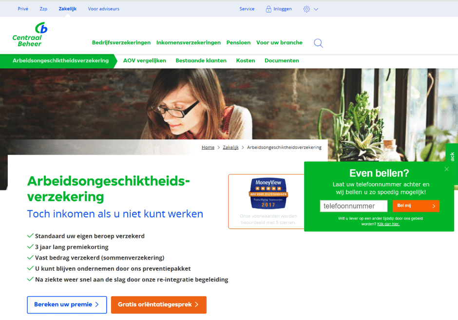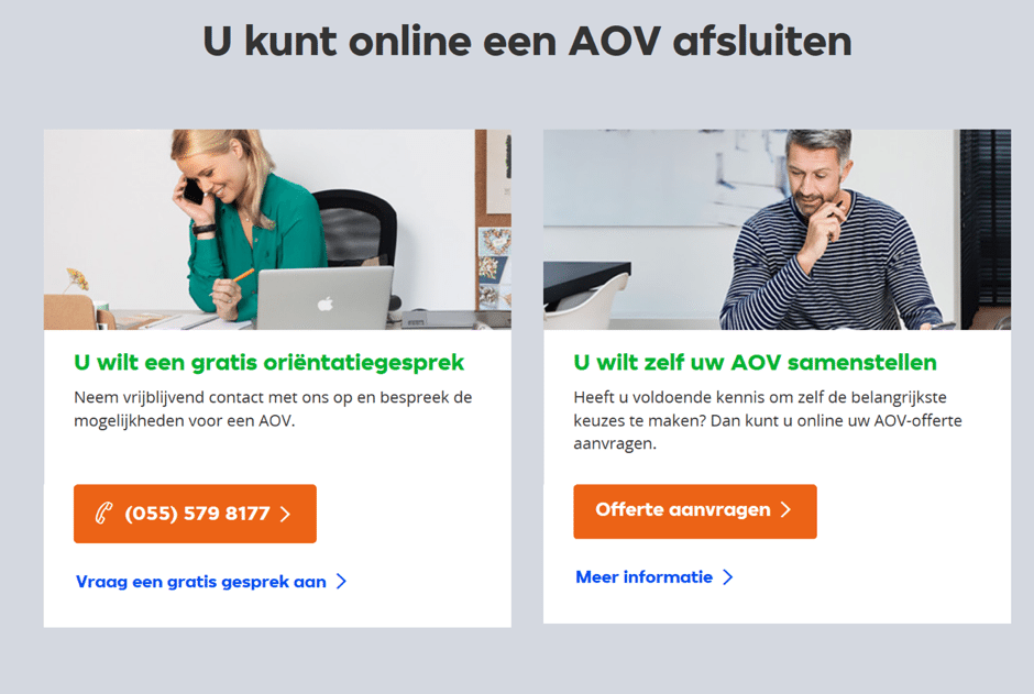 Er kan een gratis oriëntatiegesprek worden aangevraagd, wat de indruk wekt dat de consument bij CentraalBeheer.nl terecht kan om persoonlijk advies op maat te krijgen. Er wordt tevens duidelijk aangegeven dat het ook mogelijk is om zelf direct online een AOV samen te stellen indien de consument voldoende kennis heeft om de belangrijkste keuzes zelf te maken.