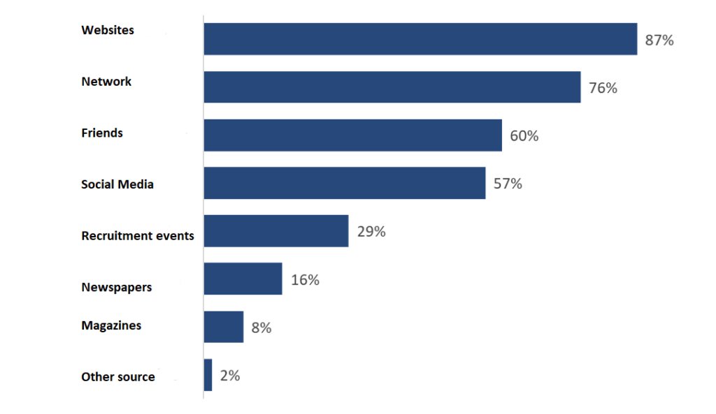 Meer dan 85% van de werkzoekenden geeft aan dat ze websites gebruiken om naar geschikte vacatures te zoeken. Vrienden (60%) of hun eigen netwerk (76%) staan op de tweede plaats. Social Media zijn ook populair; 57% zegt dat ze sociale media gebruiken om een baan te vinden. Kranten en tijdschriften zijn het minst populair: in totaal zegt 16% dat ze dit medium prefereren; tijdschriften worden door 8% genoemd.