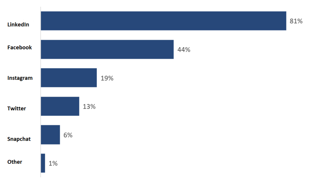 Wat betreft sociale media vroeg het onderzoek respondenten welke van deze media dan het populairst zouden zijn. LinkedIn wordt door 81% genoemd als bron voor het vinden van een baan, Facebook door 44%, en Instagram krijgt de voorkeur van 19% van de respondenten. Twitter (13%) en zelfs Snapchat (6%) worden ook genoemd – dat laatste vooral door de groep die minder dan 1 jaar geleden is afgestudeerd.