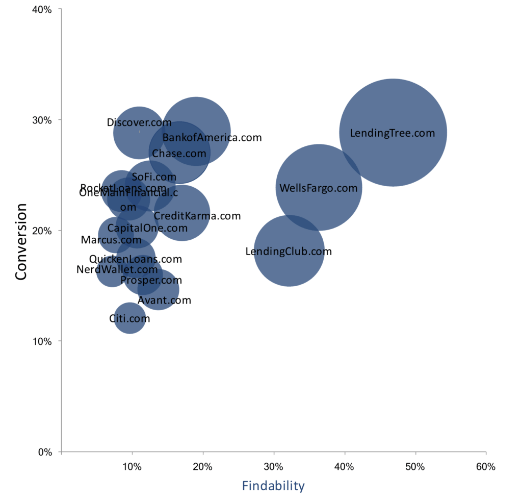 In 2017 werd de Personal Loan markt aangevoerd door LendingTree.com. Met een 14% voorkeur en Digital Sales Score van 65 (6 punten voorsprong op Wells Fargo), stonden zij op de eerste plaats. Wat interessant is, is het verschil in vindbaarheid met WellsFargo.com, waar LendingTree.com door 47% van de respondenten werd gevonden, terwijl nummer twee WellsFargo.com een vindbaarheid van 36% heeft. Een hoge vindbaarheid is echter geen goede indicator van conversie. BankofAmerica.com (4e in ons onderzoek) en Discover.com (#10) worden door minder mensen gevonden maar hebben een conversie van 29%, net als LendingTree.com.