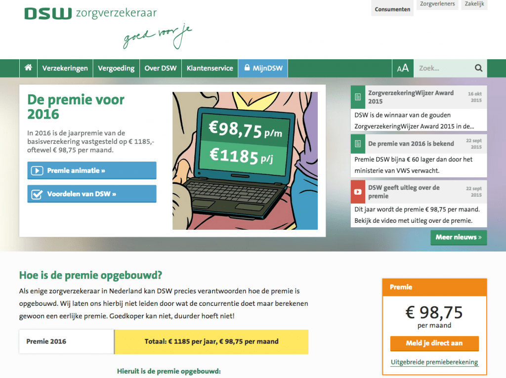 DSW kondigde vorige maand traditioneel als eerste de prijs aan voor de basispremie zorgverzekering. De premie bij DSW bedraagt in 2016 98,75 euro, dat is 3,75 hoger dan in 2014 en 2015 toen de premie neerkwam op 95 euro per maand. Wie op de website van DSW komt, ziet die premie dan ook meteen, klip en klaar, pontificaal op de homepagina staan.