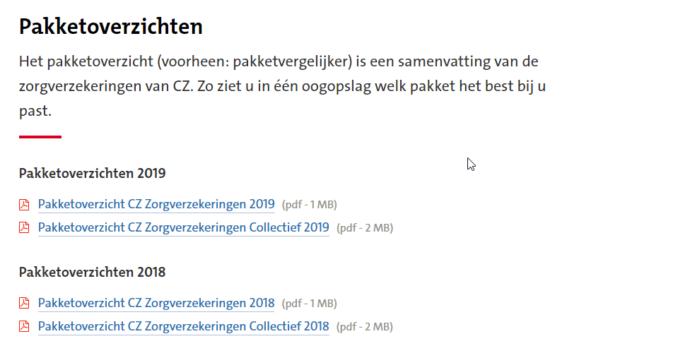 De service die CZ biedt is meer dan alleen het duidelijk tonen van contactgegevens en het verstrekken van algemene informatie. Het denkt na over zijn verschillende doelgroepen, zowel jong als oud. CZ.nl biedt bijvoorbeeld de mogelijkheid om informatie over de verschillende polissen af te drukken zodat je er op je gemak doorheen kunt lezen en vervolgens kunt vergelijken. Voor bezoekers die op zoek zijn naar wat uitgebreidere informatie is een PDF met uitleg ook zeer handig.