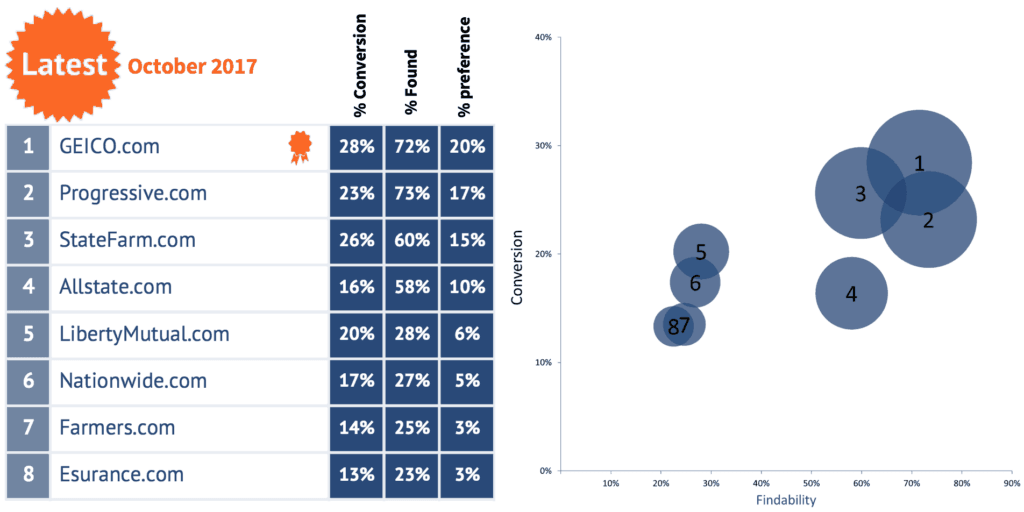 Volgens Nerdwallet.com hebben klanten van Geico een gemiddelde offerte van $1.297 per jaar. Progressive-klanten daarentegen hebben een gemiddelde offerte van $2.821 per jaar. Dat is meer dan het dubbele van de prijs van Geico. Het verschil in prijs kan een belangrijke factor zijn waarom respondenten Progressive, dat het hoogst eindigde wat betreft vindbaarheid, achter Geico rangschikten in de categorie voorkeur. Geico's lage tarieven kunnen ook verklaren waarom het bedrijf het beste presteerde in deze Digital Sales Scan.