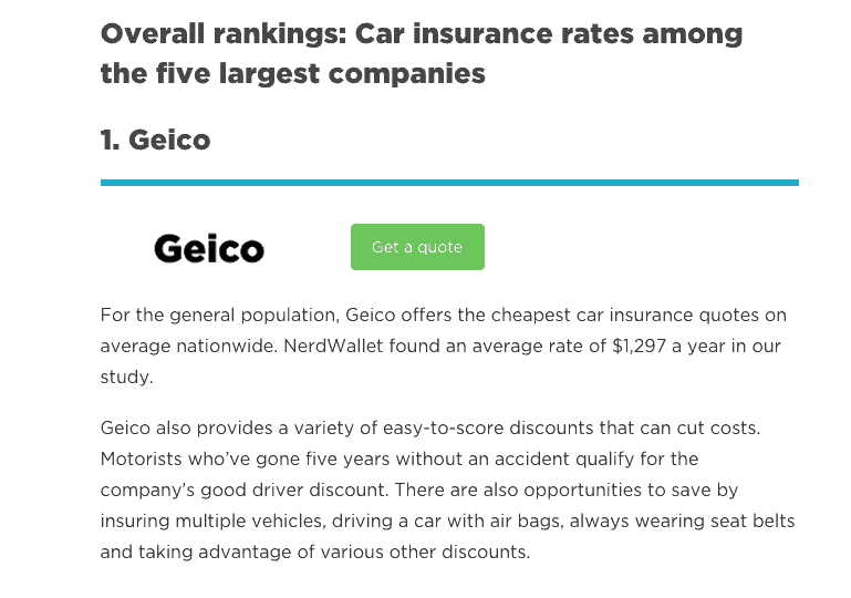 Een mooie website zal potentiële klanten aantrekken, maar als het op autoverzekering aankomt, willen bestuurders gewoon een goede deal. In ons onderzoek eindigde Geico niet bovenaan de ranglijst voor de uitstraling van hun website, noch eindigden ze het beste wat betreft merk. Waar Geico wel het beste in scoorde was productaanbod, met een score van 82.