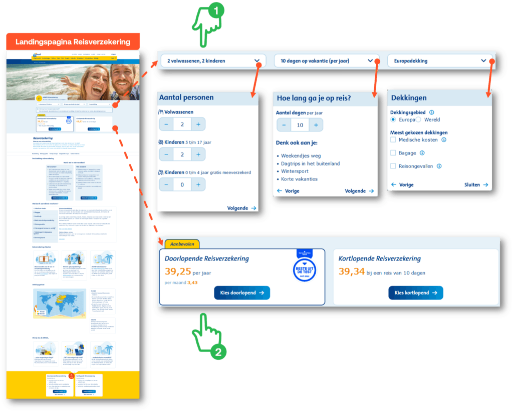 Op de ANWB landingspagina zien bezoekers direct een keuzehulp om een reisverzekering naar wens in te richten. Met pull-down menu’s kunnen ze aangeven voor hoeveel personen, hoeveel dagen en welk dekkingsgebied ze een reisverzekering willen afsluiten. Met een rekenmodule wordt vervolgens op basis van de keuzes een aanbevolen optie geboden, inclusief de bijbehorende kosten.