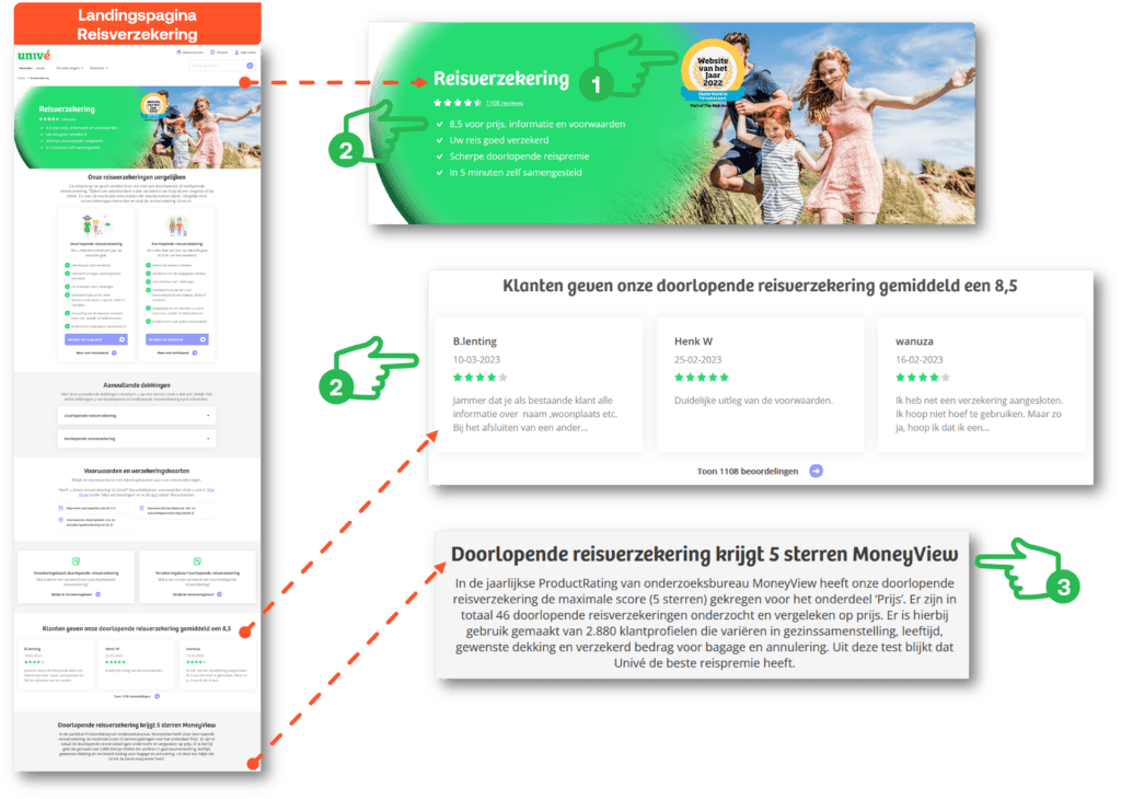 Univé besteedt extra aandacht aan social proof met een keurmerk, reviews en cijfers. De zegel ‘Website van het Jaar’ staat prominent in beeld en is direct bij landing above the fold zichtbaar. Zowel in de header als verder op de pagina wordt de consument overtuigd met klantreviews. Daarbij laat Univé expliciet zien wat klanten zeggen over de reisverzekering en is het mogelijk om alle reviews te bekijken. Ook de rating van onderzoeksbureau MoneyView draagt bij aan de overtuigingskracht van Univé. Er wordt sterk gecommuniceerd dat Univé de beste reispremie heeft.