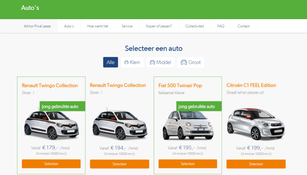 Bij betaalde zoekresultaten is het een stuk gemakkelijker om consumenten naar pagina’s te leiden die voor hun relevant zijn. Het is dan ook niet verwonderlijk dat Athlon.com het hoogst scoort op de volgende stelling die in het onderzoek wordt uitgevraagd: “de website is direct relevant”. De website laat direct het aanbod zien met daarin een handige filtertool: “Klein – Middel – Groot” om daarmee de passende auto te vinden. De belangrijkste pagina’s met informatie zijn direct zichtbaar en niet verstopt achter een (hamburger) menu. Zo is Athlon.com direct relevant voor de bezoeker die op zoek is naar een nieuwe auto, maar ook relevant voor bezoekers die eerst wat meer willen lezen.