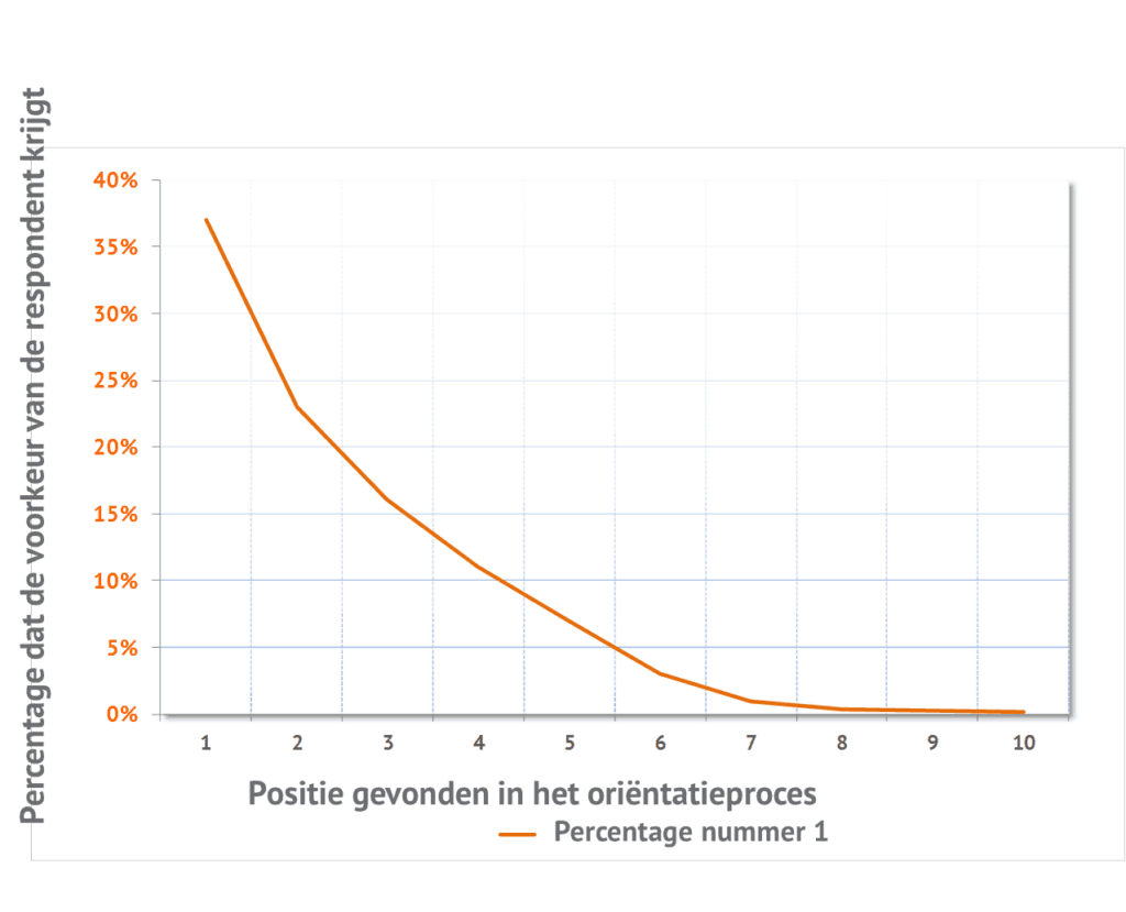 In de WUA benchmark zien we een duidelijk patroon. Websites die het vaakst als eerste worden gevonden genieten ook het vaakst de 1e voorkeur. Als website die als eerste wordt gevonden is vaak het voordeel dat de consument zich nog moet inlezen in het onderwerp en dus net wat meer aandacht aan uw website geeft. Dit geeft een website de kans om deze consument voor zich te winnen met unieke USP’s en een goed aanbod.