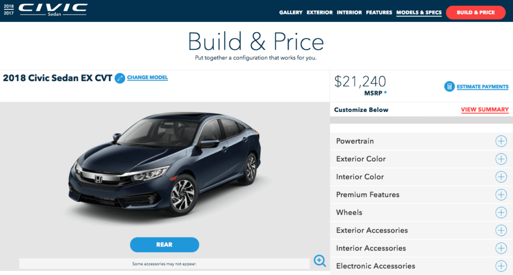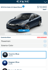 Hier zien we de standaard desktoppagina die Honda toont nadat een klant hun auto van keuze heeft geselecteerd. De pagina is schoon, simpel, en alle informatie past op één pagina. Aan de rechterkant somt Honda alle features op die de klant voor hun auto kan selecteren. Een klik op een van deze features, zoals "Exterior color," klapt uit en toont meer details. Vanaf die uitgeklapte pagina kunnen klanten de kleur van hun auto selecteren en doorgaan naar de volgende keuze. Na het selecteren van alle gewenste features voor hun auto, kan de klant op "view summary" klikken om te zien hoe alle features optellen in kosten, of ze kunnen bekijken wat de kosten van het leasen van de auto zouden zijn door "Estimate payments" te selecteren. Kortom, Honda heeft de ruimte die beschikbaar is op desktop gebruikt om een eenvoudig platform voor het bestellen van een auto te creëren, wat verklaart waarom de Japanse autofabrikant samen met Toyota de hoogste ranking kreeg voor bestelproces op desktops.