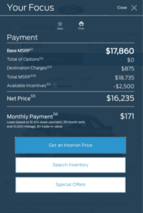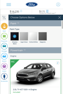 Respondenten van ons onderzoek gaven Ford een score van 84 voor het bestelproces op een smartphone, en een blik op de bovenstaande afbeeldingen toont precies waarom. Ten eerste verbergt Ford nooit de prijs van de auto. Zowel de totaalprijs als de maandelijkse leaseprijs wordt duidelijk bovenaan de pagina weergegeven, wat potentiële klanten een gevoel van transparantie geeft. Ten tweede zijn de opties op de pagina inklapbaar. Als klanten verschillende features voor hun auto willen selecteren, selecteren ze simpelweg het 'slider' icoon naast summary en het onthult de verschillende opties voor de auto. De iconen aan de linkerkant tonen de voortgang die klanten maken bij het selecteren van verschillende features, zoals te zien is in de middelste afbeelding hierboven. En als klanten willen zien hoe de kosten van de auto optellen, kunnen ze "summary" selecteren en vouwt een lijst van de kosten uit. Ford zorgt ervoor dat er geen extra tabbladen geopend hoeven te worden, en maakt het gemakkelijk voor klanten om een duidelijk overzicht te behouden over het hele bestelproces.